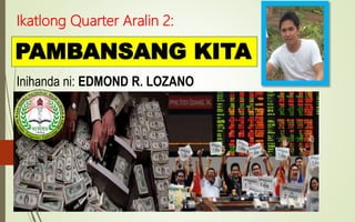 Masasabi mo bang mayaman ang ating bansa. Sa ilang taong pamumuhay dito sa mundo lalo na sa bansang iyong ginagalawan hindi ka lang simpleng mamamayan. Aralin 2Pambansang kitaIto ang gawa ng group 2 ng grade 9 PrudenceAno nga ba ang Pambansang KitaAng Pambansang Kita ay ang kabuuang halaga ng mga tinatanggap na kita ng mga sektor ng ekonomiyaAng pagsukat ng Pambansang KitaIto ay sumusukat sa kabuuang halaga ng mga produkto at serbisyong ginawa ng mga mamamayan ng isang bansa maging.