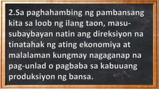 Tumutukoy sa lagay ng ekonomiya sa isang bansa. Suriin ang ipinahihiwatig ng larawan sa abot ng iyong makakaya. Mahalagang masukat ang economic performance ng.