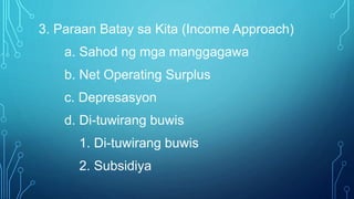Kaalaman tungkol sa pambansang kita at kung bakit. PAMBANSANG KITA PPPPPPPPPPPPPPPPPPPPPPPPPANG Pangkat 2 Cordita Ryan Paqueo Zion Salas Sam Cordova Julia MGA. Reggie PongasiWorldPambansang Kita-ito ay ang kabuuang halagang mga tinatanggap na kitang mga sektor ng ekonomiyaKAHALAGAHAN NG PAGSUKAT SA PAMBANSANG KITA1Nagbibigay ng ideya tungkol sa antas ng produksiyon2Gabay sa.