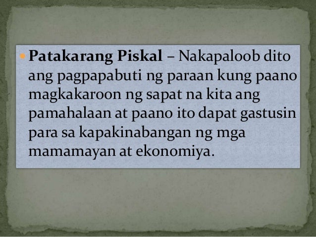 Patakarang Piskal Nakapaloob dito ang pagpapabuti ng paraan kung paano magkakaroon ng sapat na kita ang pamahalaan at paano ito dapat gastusin para sa kapakinabangan ng mga mamamayan at ekonomiya. Ano ang kita ng pamahalaan na hindi galing sa buwi. 1 Get Iba pang mga katanungan.