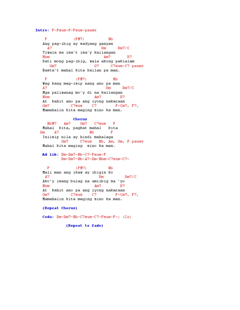 Mamahalin kita maging sino ka man chords. G C9 Ang pag-ibig ay sadyang ganyan Bm Em tiwala sa isat isay kailangan C9 Bm dati mong pag-ibig wala akong pakialam C9 D bastat mahal kita kailan pa man Verse 2. F FM7 Bb Ang pag-ibig ay sadyang ganyan A7 Dm Dm7 tiwala sa isat isay kailangan Bbm Am7 D7 dati mong pag-ibig wala akong pakialam Gm7 G7 C7sus-C7 bastat mahal kita kailan pa man Verse 2. F FM7 Bb.